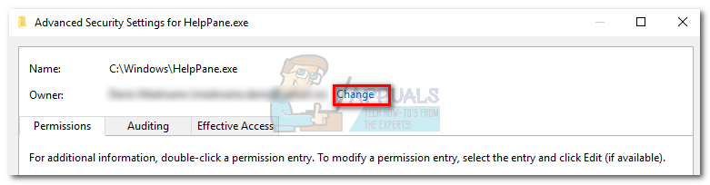 - Now look at the top of the window and click Change next to where it says, Owner.
