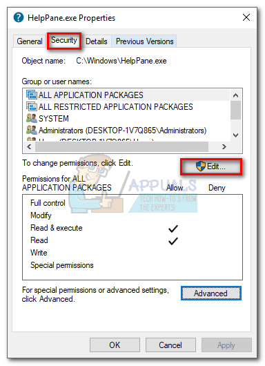 - Go back to HelpPane.exe’s Properties, select the Security tab and click the Edit button next to change permissions, click Edit.