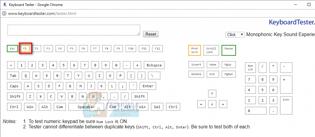 Before you determine that your keyboard isn’t the culprit, use this online tool (here) to check if the F1 key is not pressed automatically by a faulty keyboard. Simply click on Launch the Tester and observe if the F1 key is highlighting without you touching anything.