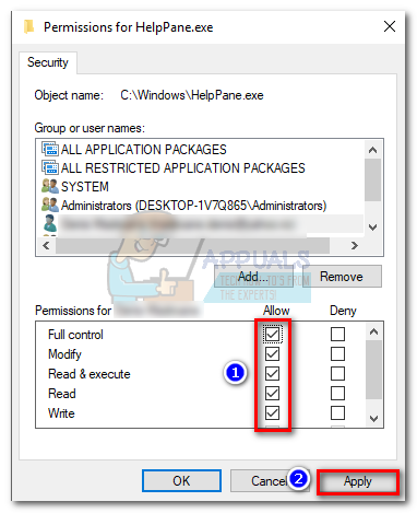 - Next, give yourself full control over the HelpPane executable by checking all the boxes under Allow. Hit Apply to confirm.