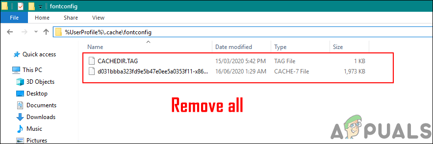 Some of the users fixed this issue by clearing the font cache files in their system. The cache font folder may have a different path for each operating system. We will be showing you this in the Windows 10 operating system. We will also show the step where you can check the path for your cache folder by opening the fonts.conf file as shown below: