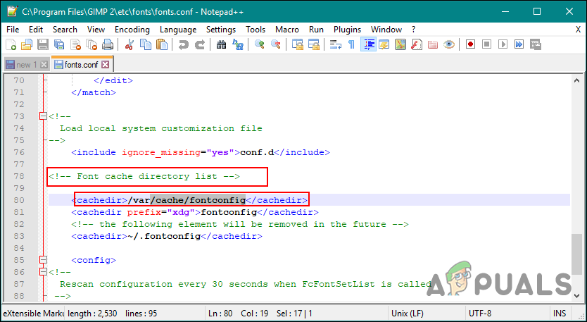 Deleting the cache font files - If you are unable to find the font cache folder in the above path, then go to the GIMP directory and open the fonts.conf file.