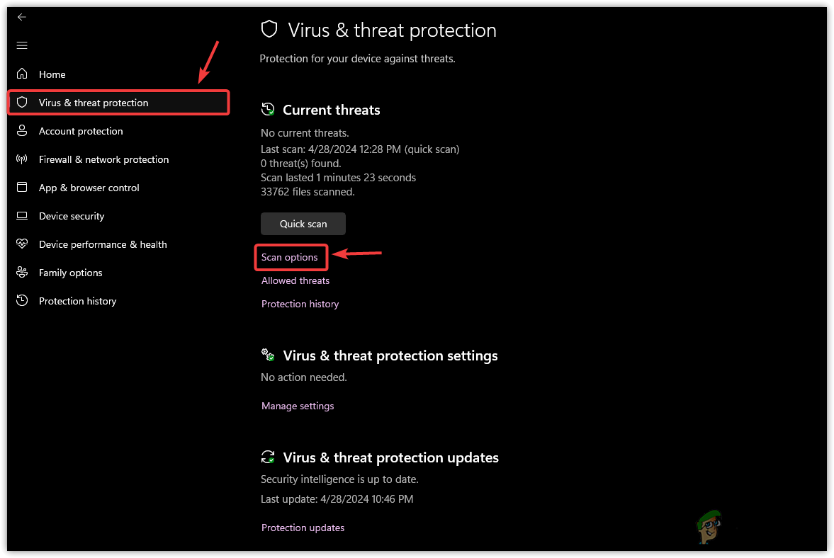 - Select Virus & Threat Protection from the listed options and click Scan Options.