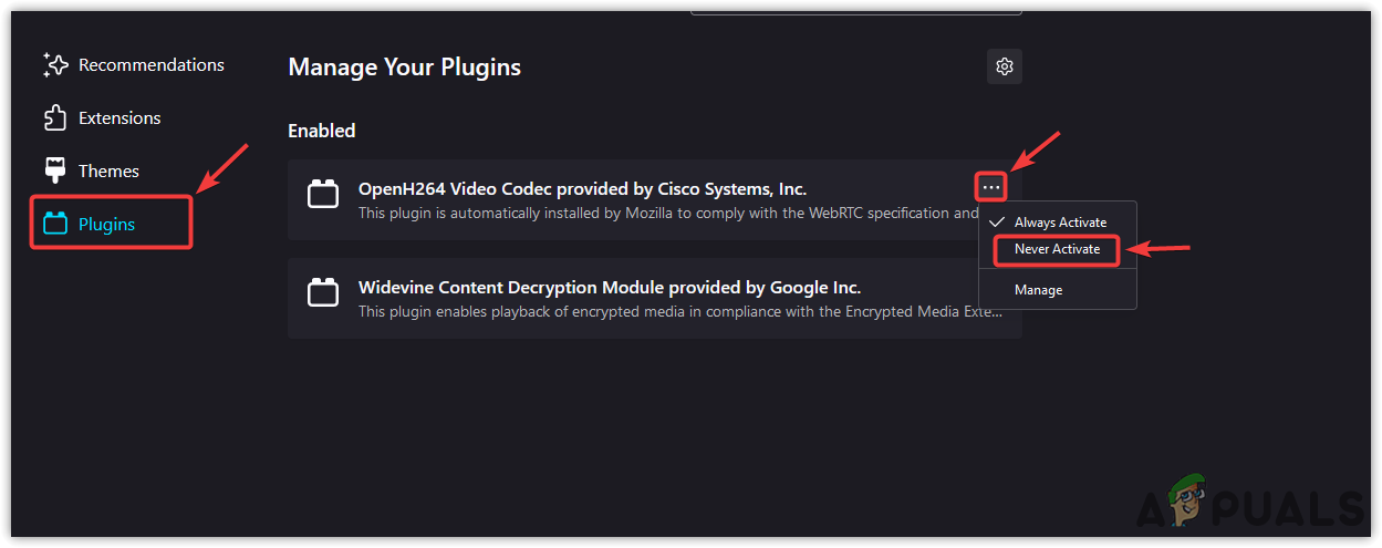 - Click the three dots and select the Never Activate option to disable the plugin.