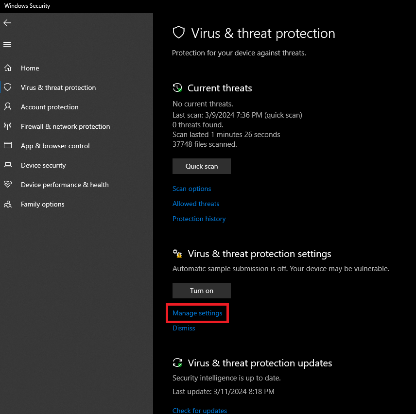 - Navigate to the Virus & Threat Protection settings and select ‘Manage settings’.