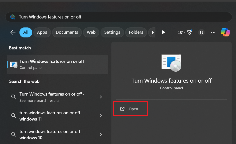 - Access the Search Bar, type “Turn Windows features on or off”, and open the feature.