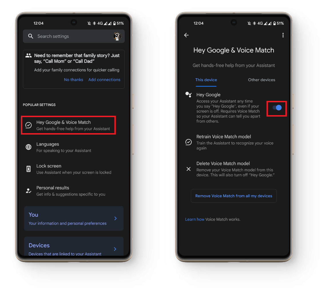 - Turn on the toggle switch for “Hey Google.”