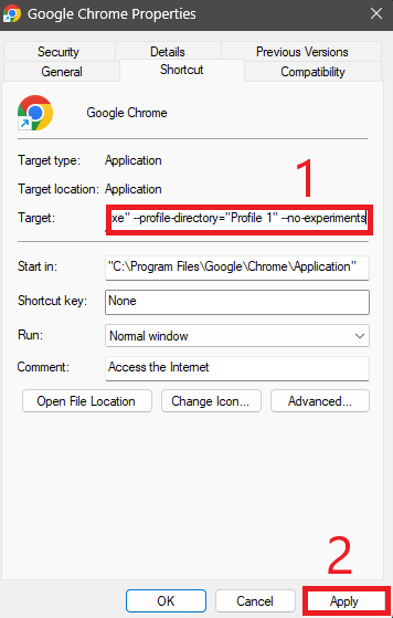 --no-experimentsfrom the shortcut. - Restart Chrome normally.