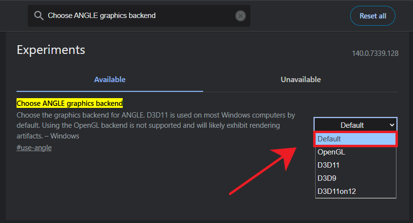 ANGLE is the middle layer that converts Chrome’s graphics commands into GPU-friendly instructions. If ANGLE uses the wrong backend (like Vulkan or D3D11 when your GPU can’t handle it), Chrome shows a black screen. Resetting it restores the best compatible mode for your system.