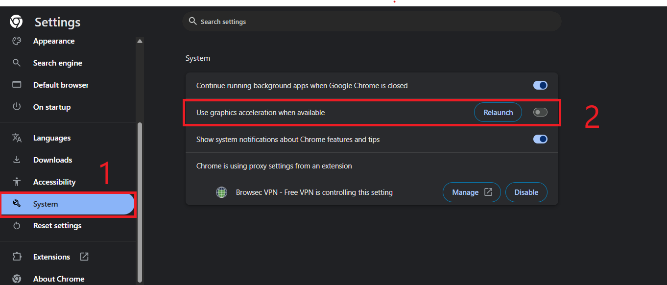 Turning off hardware acceleration forces Chrome to use software rendering instead. This may be slightly slower on graphics-heavy pages but is often much more stable when you are facing black screen issues.