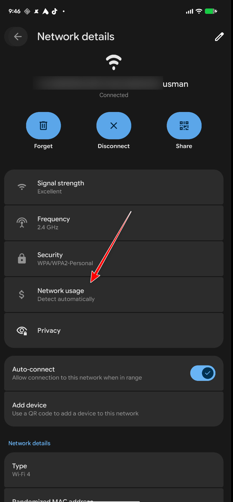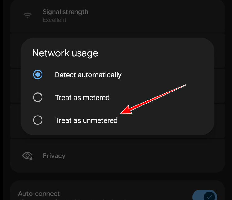 If your phone thinks your Wi-Fi has limits, Drive will block uploads to save data. Marking the connection as “unmetered” tells your phone it’s safe to use for uploading.