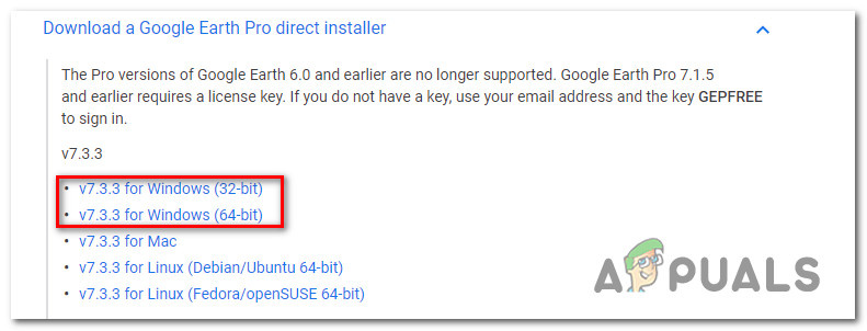 - Once inside, expand the drop-down menu associated with Download a Google Earth Pro direct installer, then click on the most recent version that’s compatible with your OS architecture (32-bit or 64-bit).
