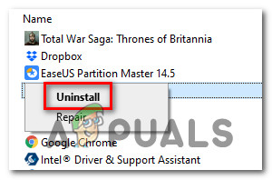 Opening the Programs and Features window via Run command - Once you’re inside the Programs and Features menu, scroll down through the list of installed programs and locate your existing installation of Google Earth. When you see it, right-click on it and choose Uninstall from the context menu.