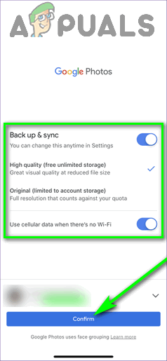 Tap on OK - On the next screen, specify if (and how) you want Google Photos to backup the photos on your iPhone or iPad, and tap on Confirm.
