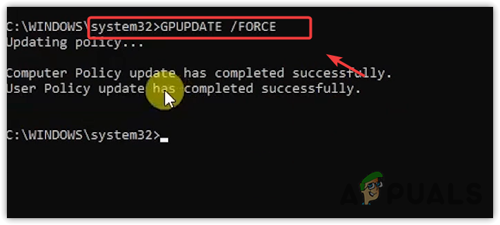 - Close the windows and, in the command prompt, type `gpupdate /force` and hit Enter to force the Group Policy update.