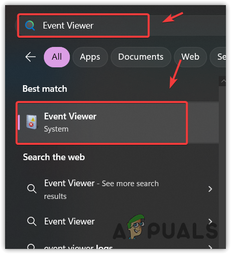 - Press the Start Menu and type Event Viewer.