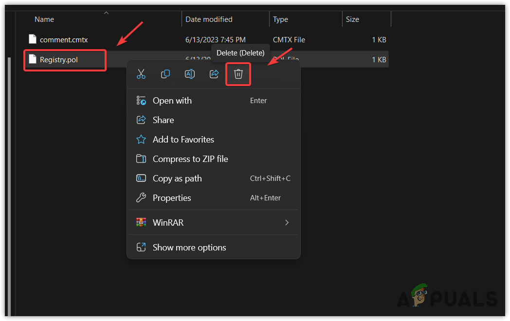 - Here, delete the Registry.pol file and restart the computer.