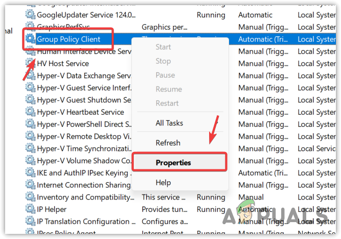 - Locate the Group Policy Client, right-click on it, and select Properties.