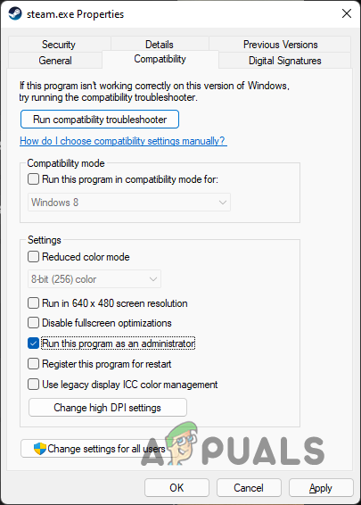 - Next, move down to the Settings section and check the box associated with Run this program as administrator.