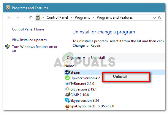 Open up the Programs and Features menu - Once you’re inside the Programs and Features screen, locate the Steam installation, right-click on it and choose Uninstall from the context menu.