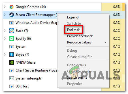 - Inside the list of processes, locate the entry associated with Steam, right-click on it and choose End Task from the context menu.