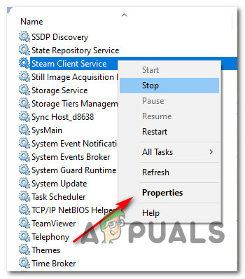 Accessing the Services screen - Once you’re inside the Services screen, move over to the right-hand side and scroll down through the list of services until you locate the Steam Client service. Once you see it, right-click on it and choose Services from the context menu that just appeared.