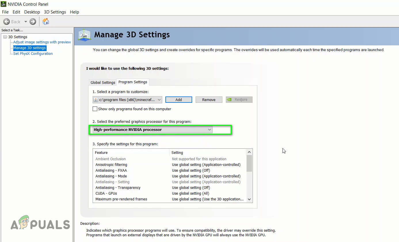 Select the preferred graphics processor for this program to select the High-performance NVIDIA processor option - Lastly, exit from the Control Panel and launch the game to verify the problem.