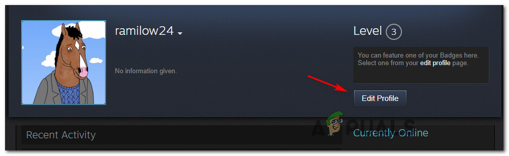 A lot of affected users have confirmed that the problem was fixed and the game no longer crashed after they accessed their Steam settings and cleaned any special characters from their Steam name. Changing the Steam profile name can be done directly from your Profile section by clicking on Edit Profile.