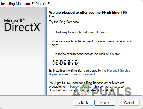 Agreeing to DirectX Agreement - You can choose to install Bing Bar. If you do not wish to, simply uncheck the Install the Bing Bar option provided. Then, click Next.