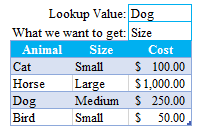 If you want to find the value of “Dog” in the DogTable and return its size, you will specify the column number starting from the first column of the range.