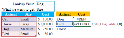 Although the VLOOKUP function is finding the value “Dog” in our table, we are asking it to return the 3rd column value. That’s strange but our table only consists of two columns. In this case, we need to expand the range of our Table_Array to include the “Cost” column. Once this is done our #REF! error message will disappear.