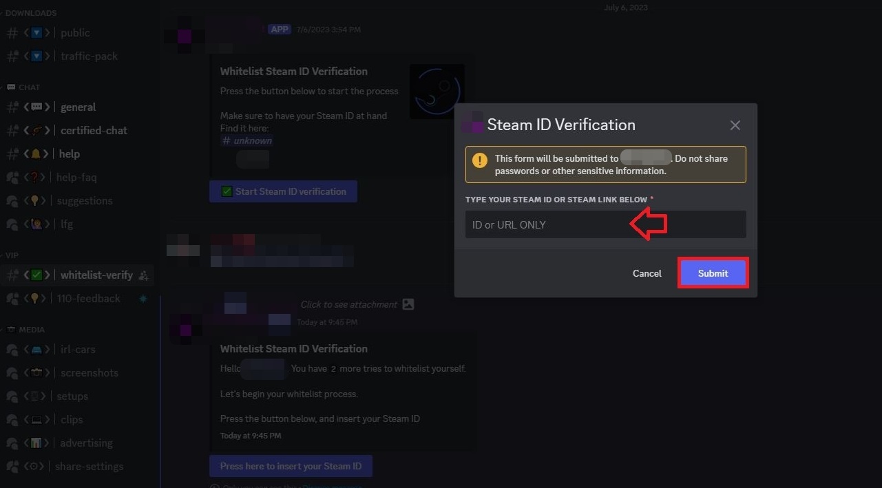 - Paste the Steam ID into the Discord verification prompt and click Submit.