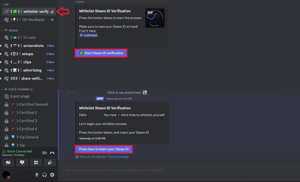 - On the Discord server, go to the ‘Verify’ or ‘Whitelist’ channel. Click the ‘Start Steam ID verification’ button, then select ‘Press here to insert your Steam ID’.