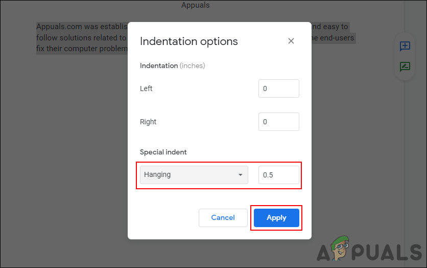 Applying hanging indent - Click on the Apply button and you will notice a hanging indent applied to your paragraph. However, the hanging indent will automatically apply to anything you write below this paragraph.