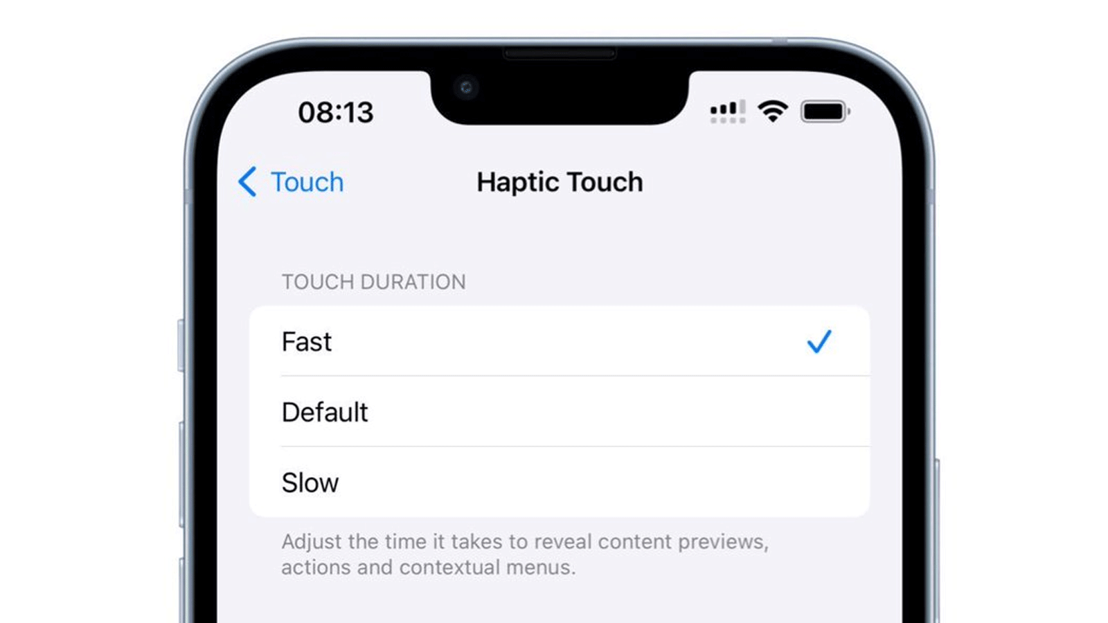 Go to Settings > Accessibility > Touch > Haptic Touch and choose “Fast” or “Slow.”