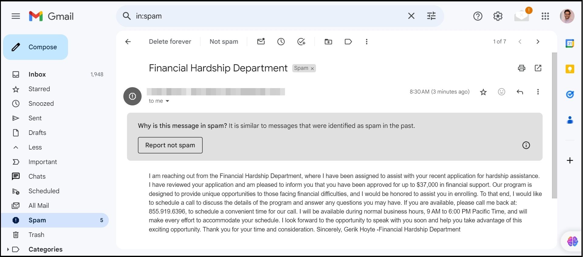 Be cautious if you get an email from the “Financial Hardship Department” or a similar source without requesting it. Emails offering quick money or financial help out of the blue should be treated with suspicion, especially if you didn’t ask for help.