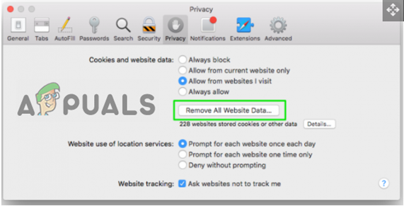 Open Safari Preferences - Then, click on the option box Remove All Website Data next to Cookies & other website data.