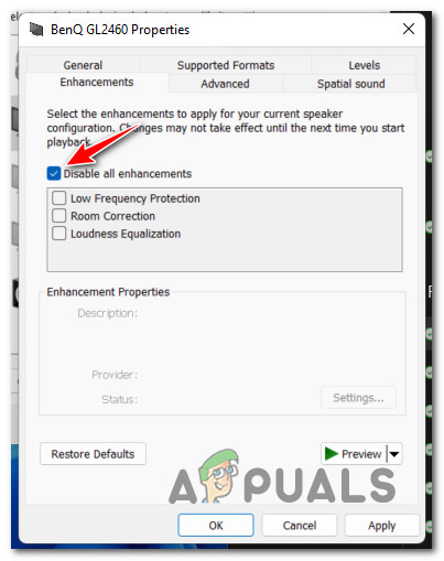 IMPORTANT: A dedicated audio card will probably have its own audio enhancement settings if you’re utilizing one. In this case, deactivating them from the dedicated utility is recommended since doing so will not fix the problem. If you’re using SRS Premium Sound or SRS Premium Sound, uncheck the option next to Audio Enhancement in the dedicated app.