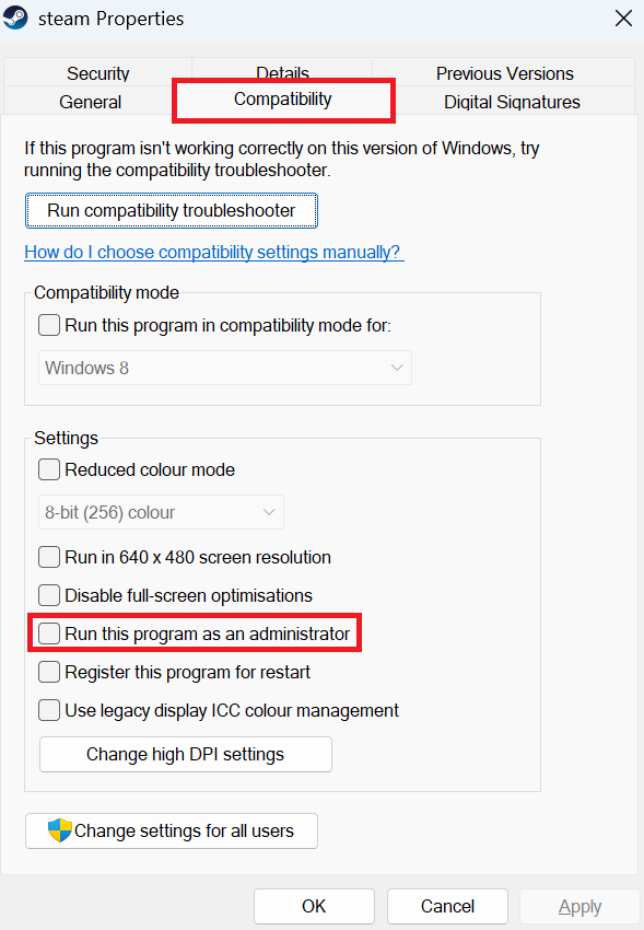 - Go to the Compatibility tab and check the box next to Run this program as an administrator.