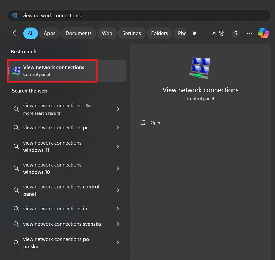- Type “view network connections“ in the Windows search bar and select the first result (Control Panel > Network Connections). This will display all your active network adapters (Wi-Fi, Ethernet, etc.).
