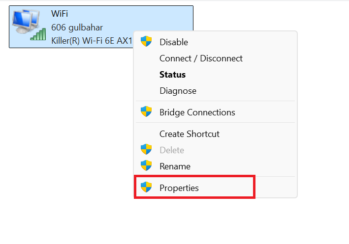 - Right-click your active network connection (Wi-Fi/Ethernet) and select Properties.