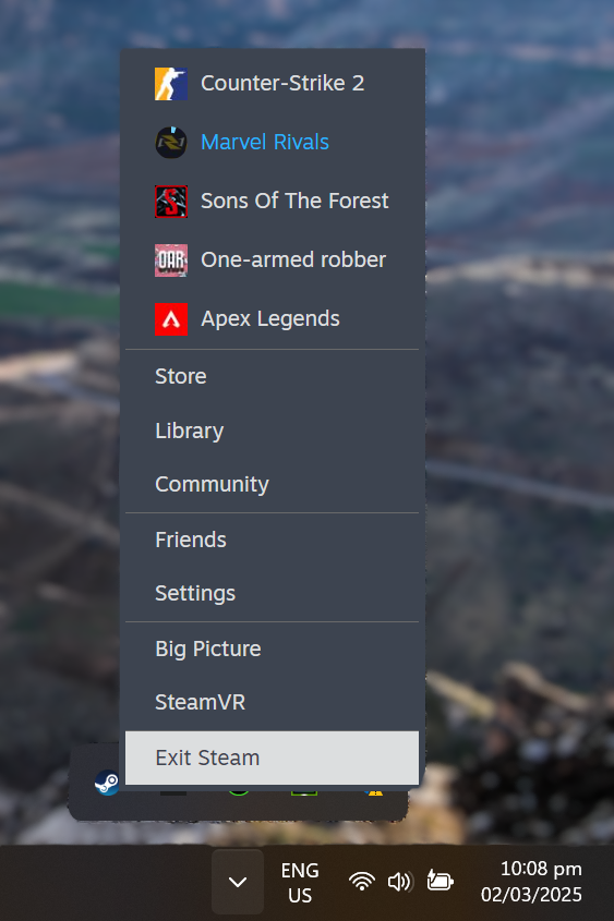 - Close Steam completely. Locate the Steam icon in the hidden icons area (system tray), right-click on it, and select Exit.