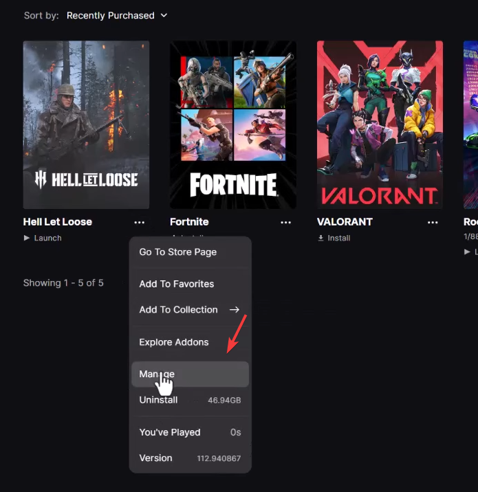 - If you’re using Epic Games Launcher, click the three dots next to Hell Let Loose and choose Manage.