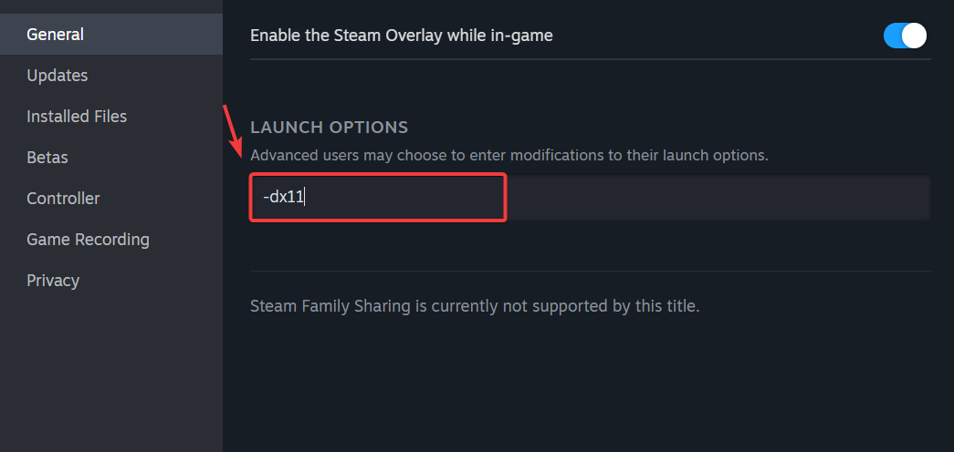 - Enter -dx11 in the command line box to force the game to run in DirectX 11 mode.