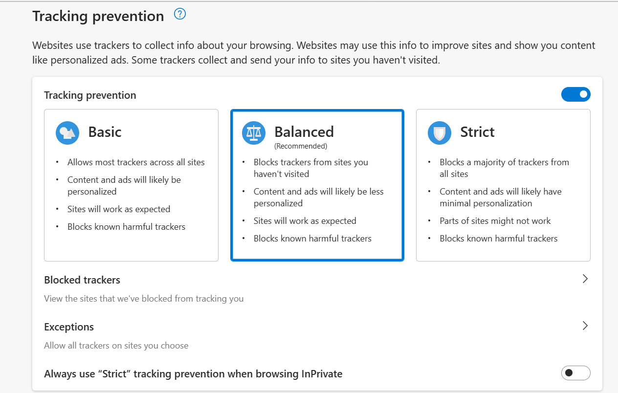 Microsoft Edge emphasizes security and privacy, with customizable tracking prevention modes: Basic, Balanced, and Strict. For maximum privacy, select Strict—though note that some website features may be affected.