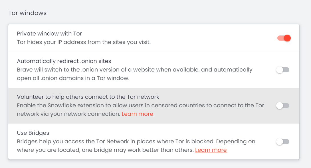 Brave also features integrated Tor browsing, accessible within the privacy settings for enhanced anonymity.