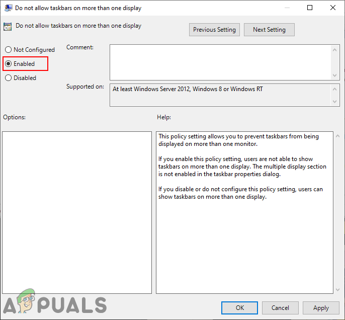 Navigating to the setting - Open the “Do not allow taskbars on more than one display” setting by double-clicking on it. Now change the toggle option from Not Configured to Enabled.