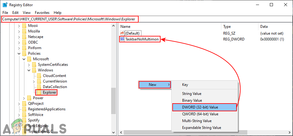 - Create a value by right-clicking on the right pane and choosing the New > DWORD (32-bit) Value option. Name this value as “TaskbarNoMultimon“.