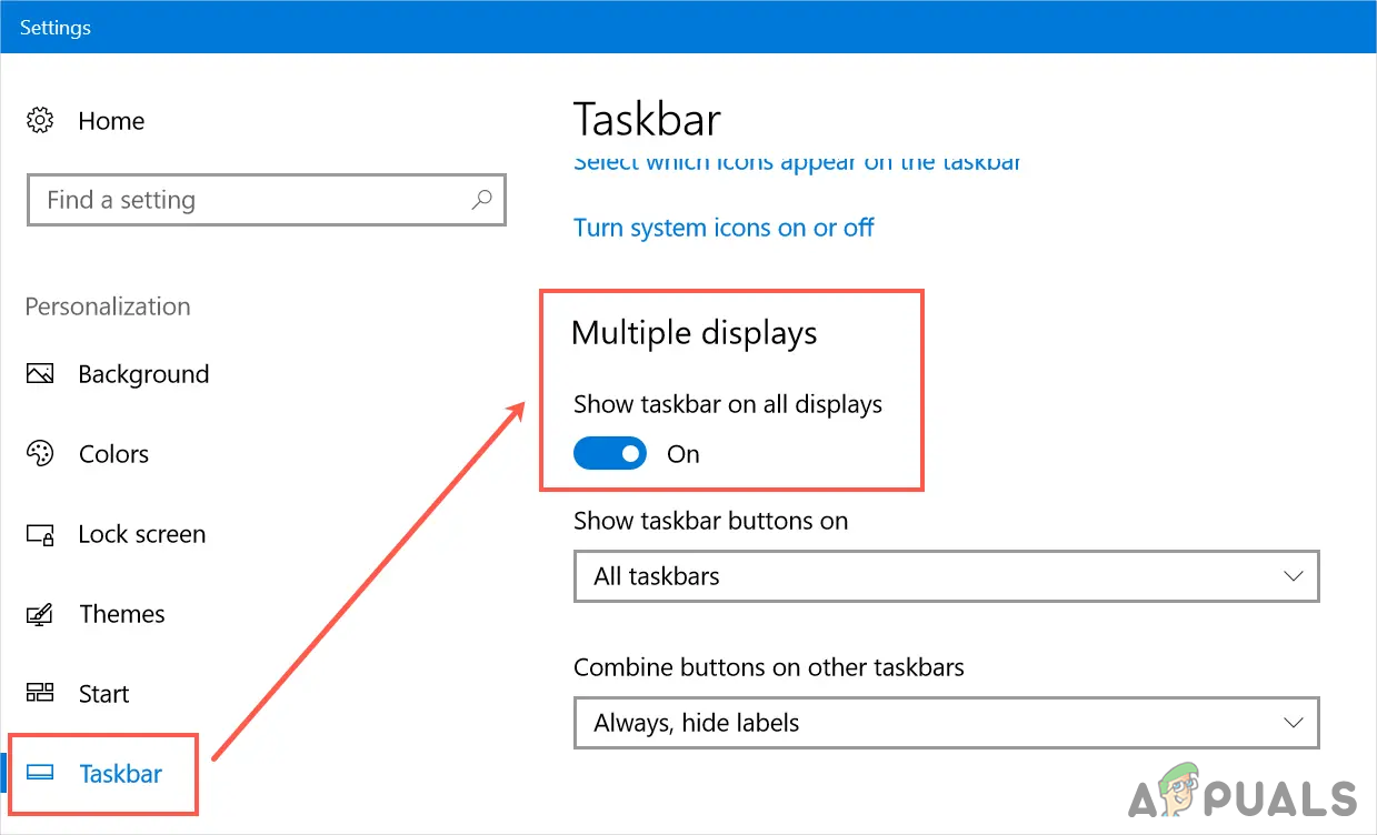 The Taskbar for multiple displays can be enabled or disabled through the Settings app. This specific setting can be found under the Taskbar settings. This is the default method for configuring this specific setting on Windows 10. However, if this setting is grayed out, then try checking other methods for enabling or disabling this setting.