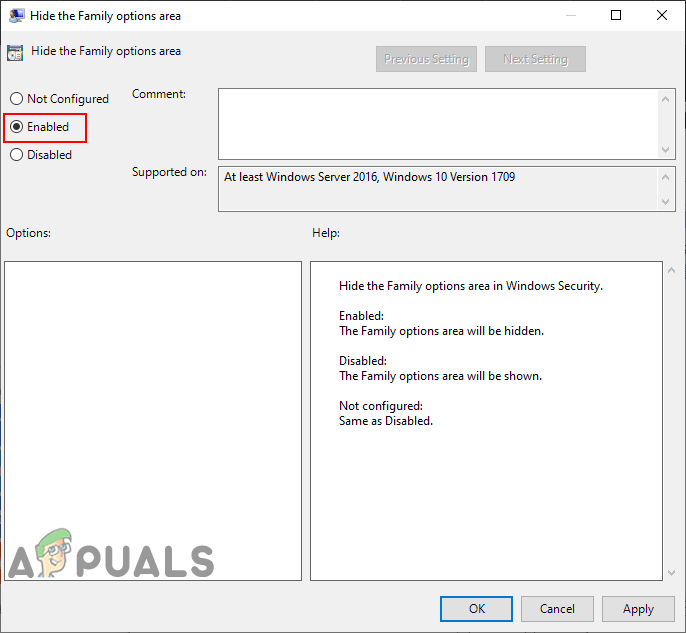 Navigating to the setting - Double-click on the setting named “Hide the Family option area” and that will open in another window. Now you need to change the toggle option from Not Configured to Enabled.